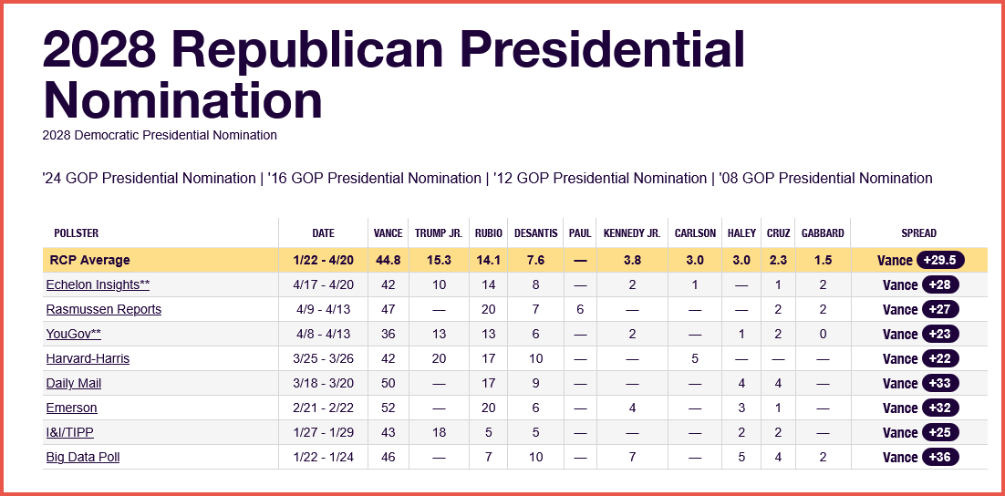Early polling shows J.D. Vance at 45%, far ahead of the field, with Donald Trump Jr. at 15% and Marco Rubio at 14%. The RealClearPolitics average gives Vance a commanding +29.5 point lead, suggesting a race that—at least for now—looks more consolidation than competition.