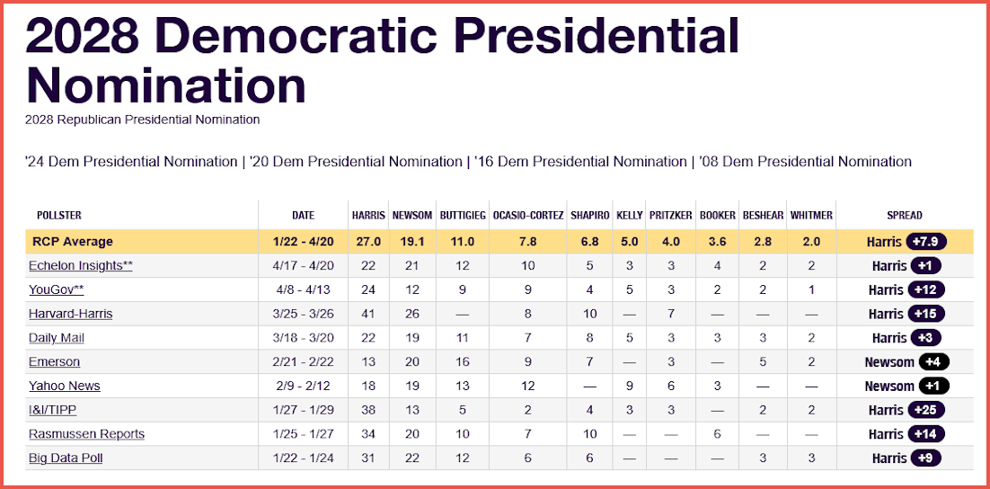 The Democratic race is far tighter. Kamala Harris leads at 27%, followed by Gavin Newsom at 19% and Pete Buttigieg at 11%. The RealClearPolitics average shows Harris ahead by just +7.9 points, suggesting a competitive primary with multiple viable contenders.