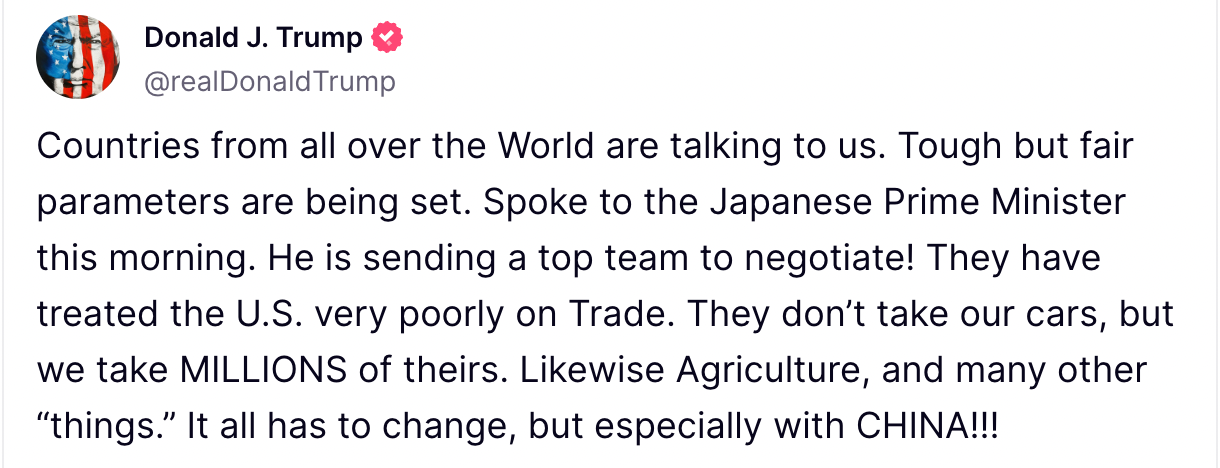 In a recent Truth Social post, U.S. President Donald Trump highlighted that countries worldwide are engaged with the U.S. and "tough but fair" parameters are being set for future agreements. He specifically mentioned a conversation with Japanese Prime Minister Shigeru Ishiba, revealing that Japan will send a top team to the negotiating table.