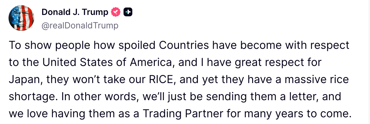 In a post on Truth Social, Trump wrote, “To show people how spoiled countries have become with respect to the United States of America, and I have great respect for Japan, they won’t take our rice, and yet they have a massive rice shortage.”
