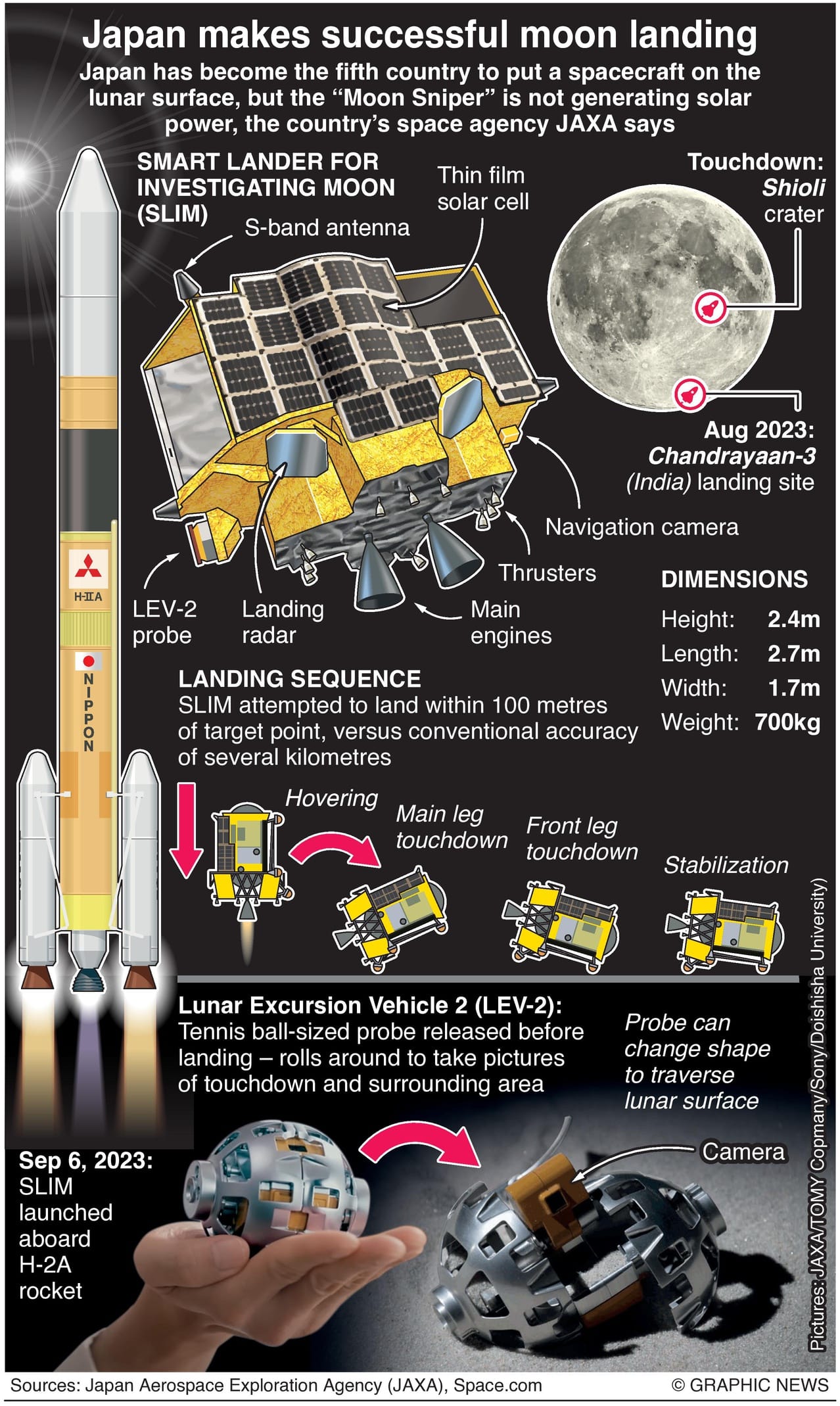 The Japan Aerospace Exploration Agency (JAXA) said its Smart Lander for Investigating Moon (SLIM) landed the moon's surface at around 12:20am (15:20GMT Jan 19) and re-established communication with earth, but its solar panels were not able to generate electricity, possibly because they are angled wrong.