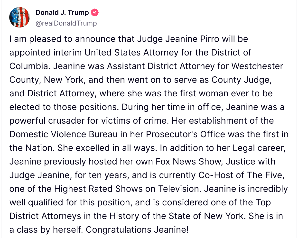 President Donald Trump on Thursday announced the appointment of Fox News host Jeanine Pirro as the top federal prosecutor for Washington, D.C., replacing his earlier nominee, Ed Martin Jr. Pirro, a former New York judge and county prosecutor, has been a prominent voice on Fox since 2006 and currently co-hosts “The Five.” Her appointment marks another example of Trump tapping allies from the conservative media sphere for high-profile government roles.