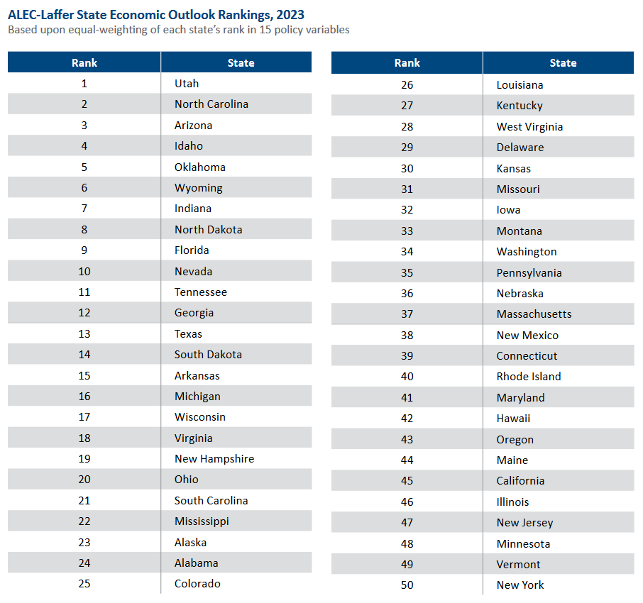 With that in mind, it’s no surprise the top five states in economic outlook for 2023 are Utah, North Carolina, Arizona, Idaho, and Oklahoma. The least competitive states may not come as a surprise either: Illinois, New Jersey, Minnesota, Vermont — with New York dead last.