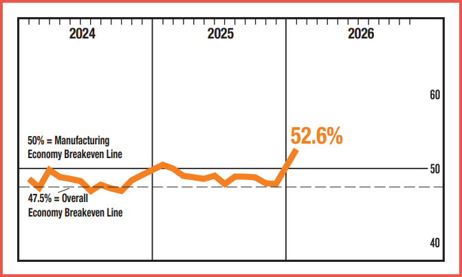U.S. manufacturing activity moved back into expansion in January, with the ISM index rising to 52.6, above the 50 level that signals factory growth. Manufacturing had been below that mark for more than two years.