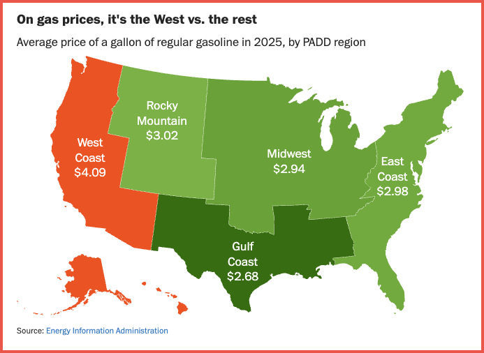 Gas prices in California and Washington were the highest in the nation in 2025, with California’s lowest weekly average price still about 88 cents higher than the highest weekly price seen in New York, according to regional fuel data. The figures highlight how drivers on the West Coast consistently pay more at the pump than those in most other parts of the country.