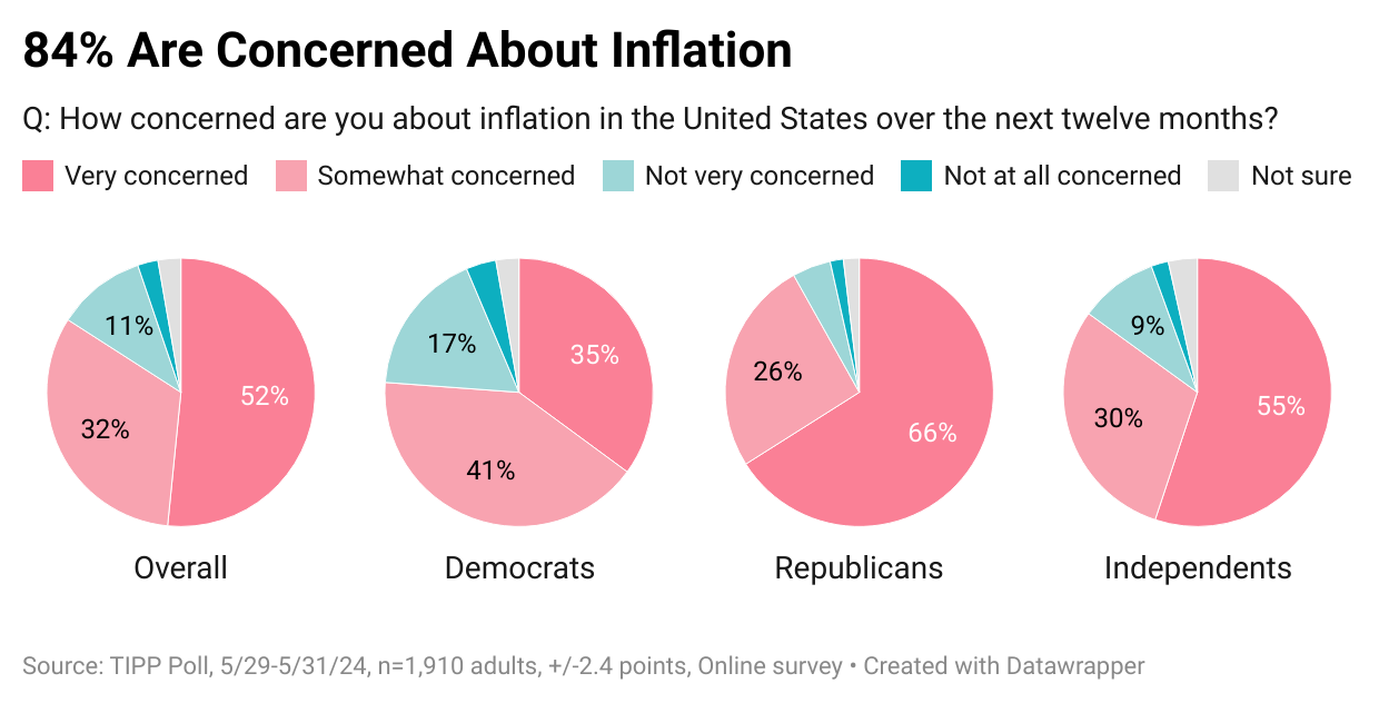 The survey showed that 84% are worried about inflation. One-half (52%) are very concerned, and another 32% are somewhat concerned.