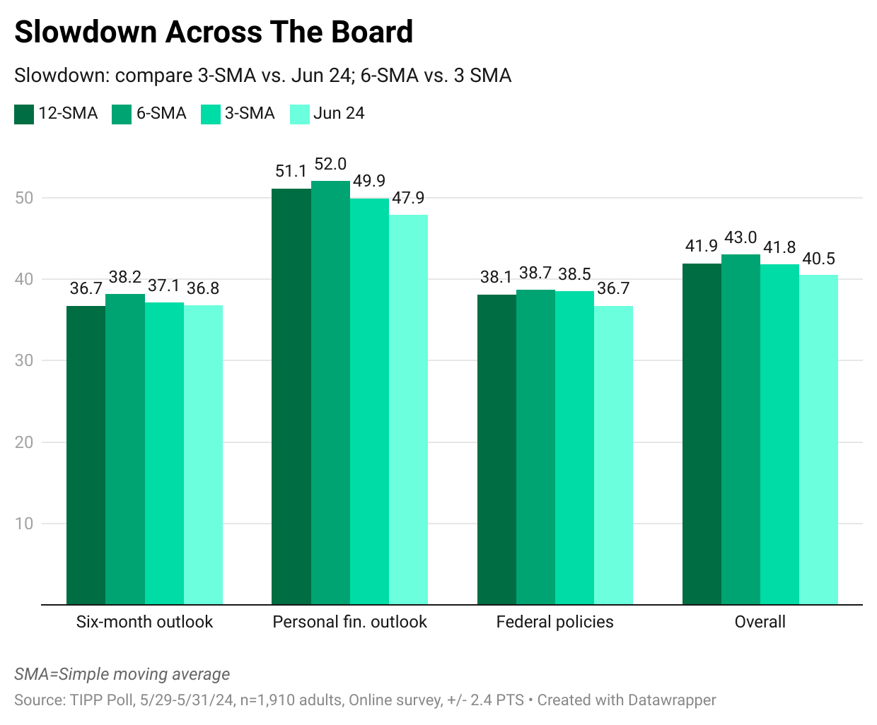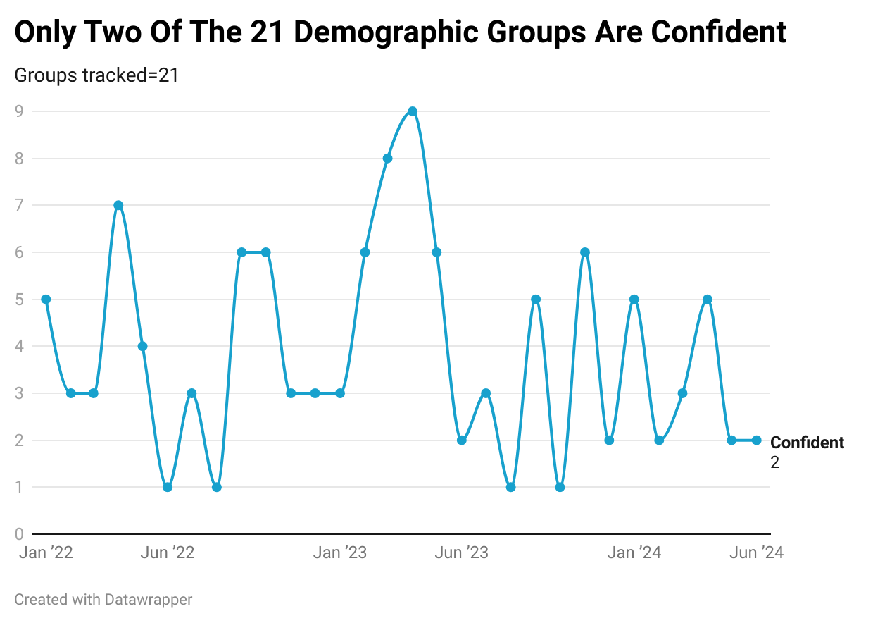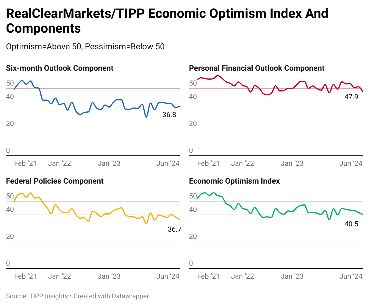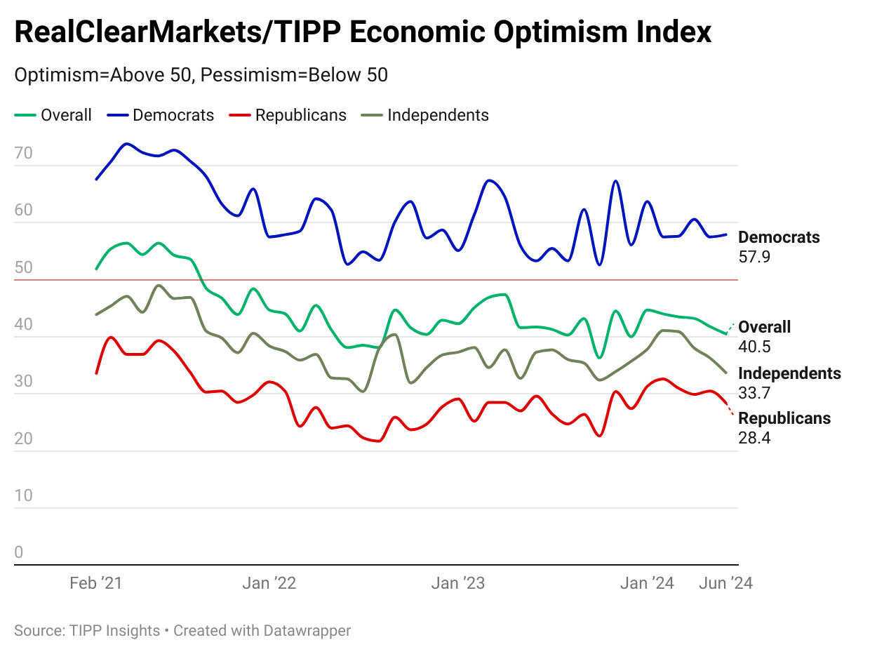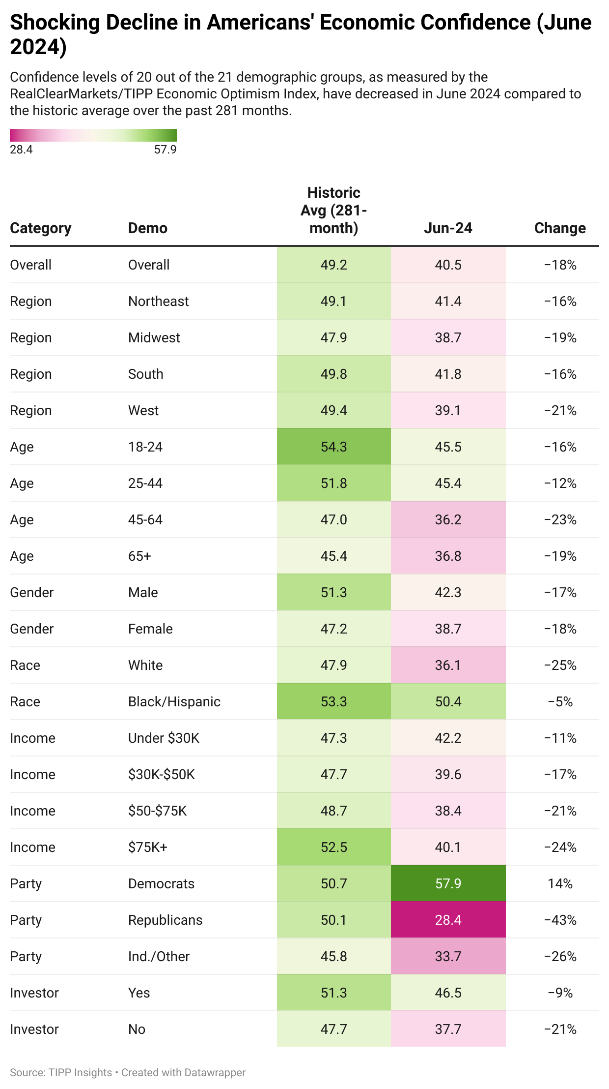 According to the RealClearMarkets/TIPP Economic Optimism Index, economic optimism levels for 20 out of 21 demographic groups declined in June 2024 compared to the historic average of the past 281 months.