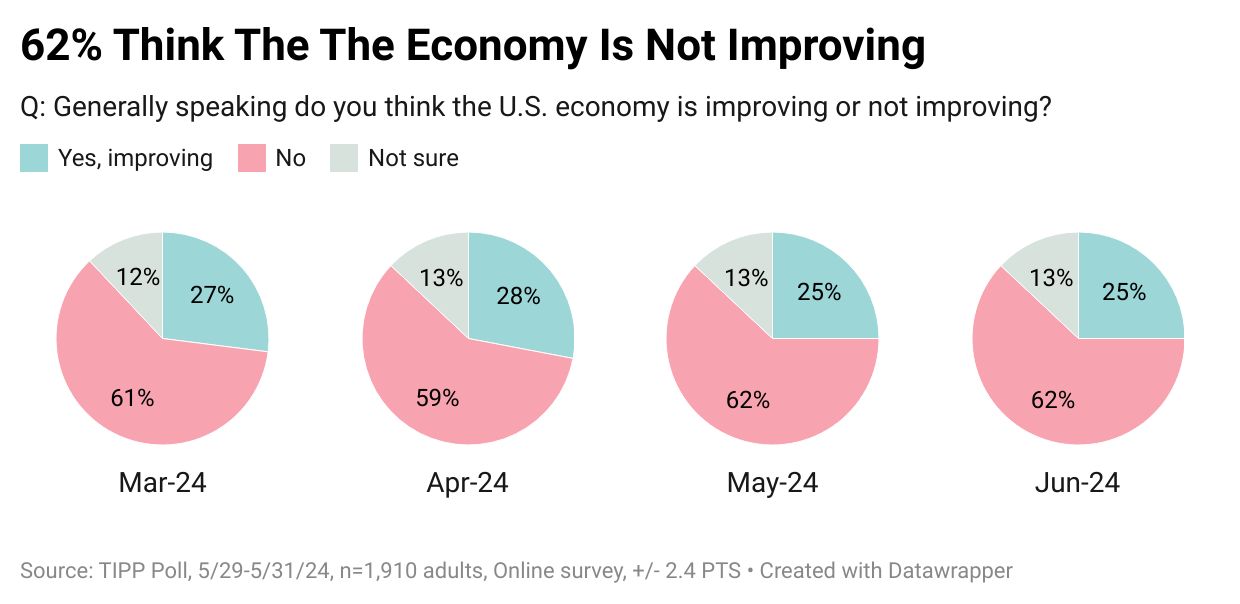 Further, nearly two-thirds (62%) think the U.S. economy is not improving, while 25% believe it is improving.