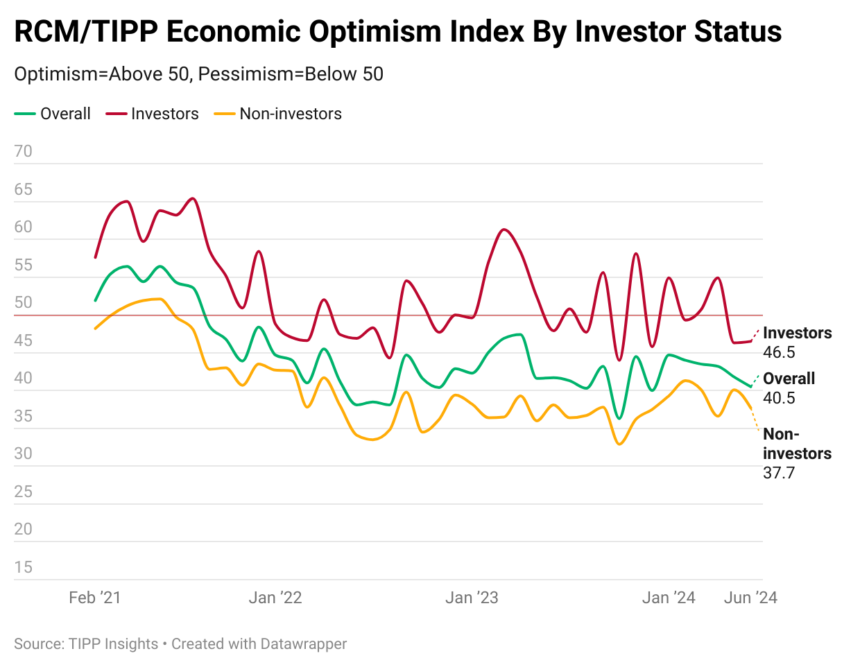 The economic optimism gap between investors and non-investors widened to 8.8 in June from 6.2 in May and 18.3 in April.