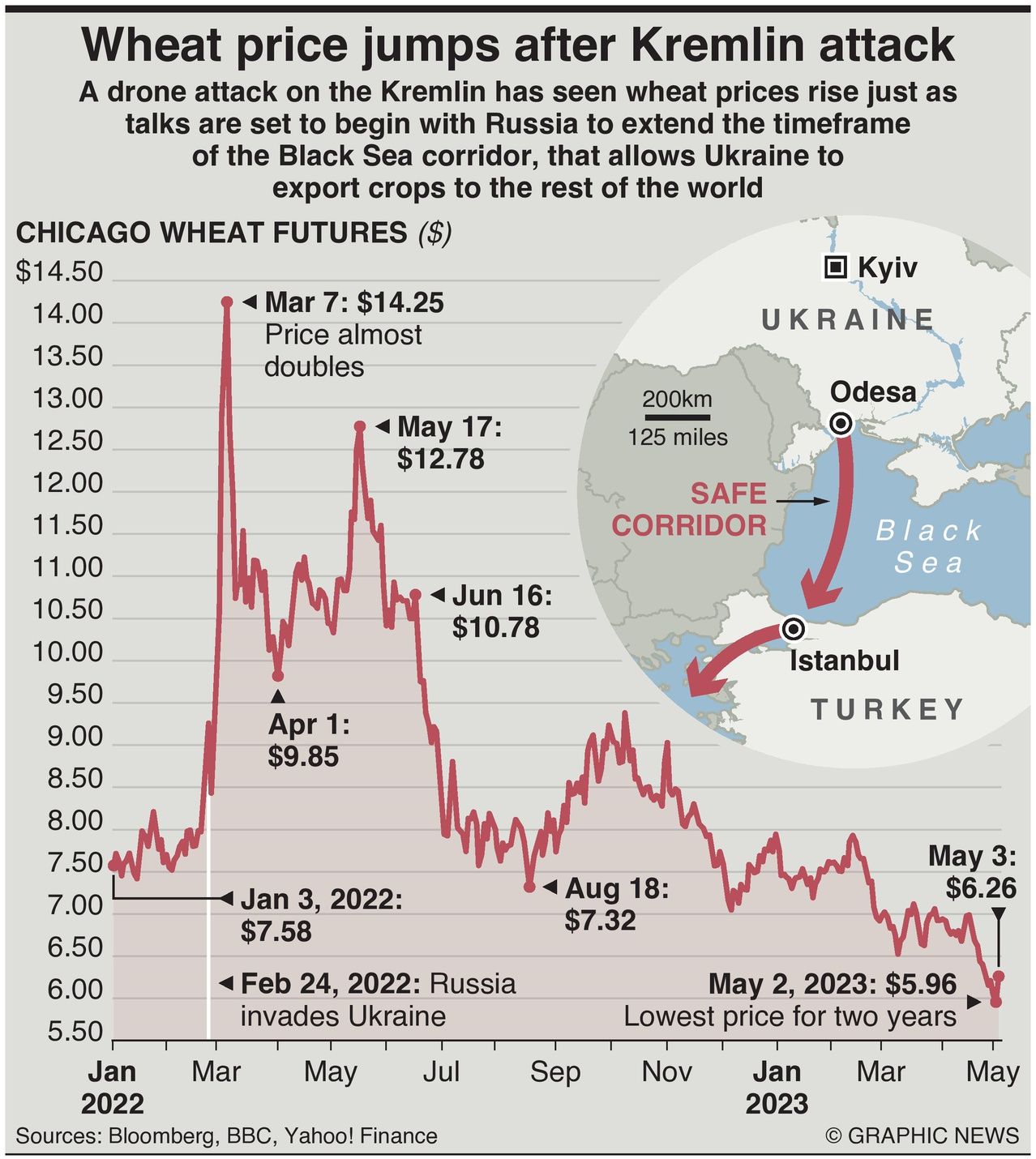 A drone attack on the Kremlin has seen wheat prices rise just as talks are set to begin with Russia to extend the timeframe of the Black Sea corridor, that allows Ukraine to export crops to the rest of the world.