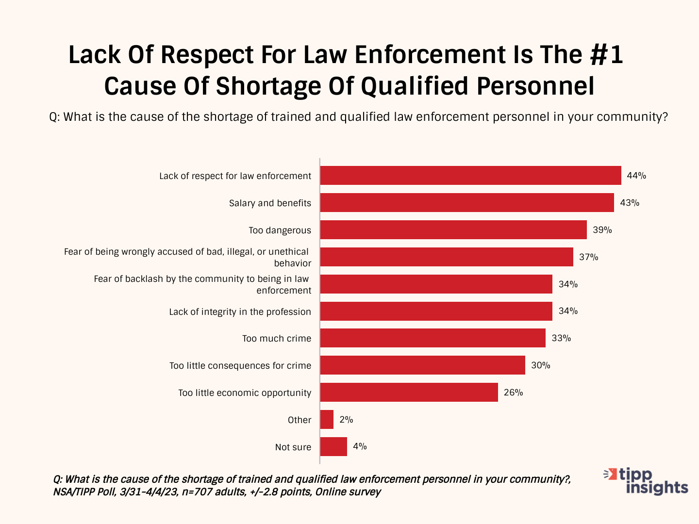 The top two reasons cited for the shortage of law enforcement personnel are a lack of respect for law enforcement (44%) and inadequate salary and benefits (43%).