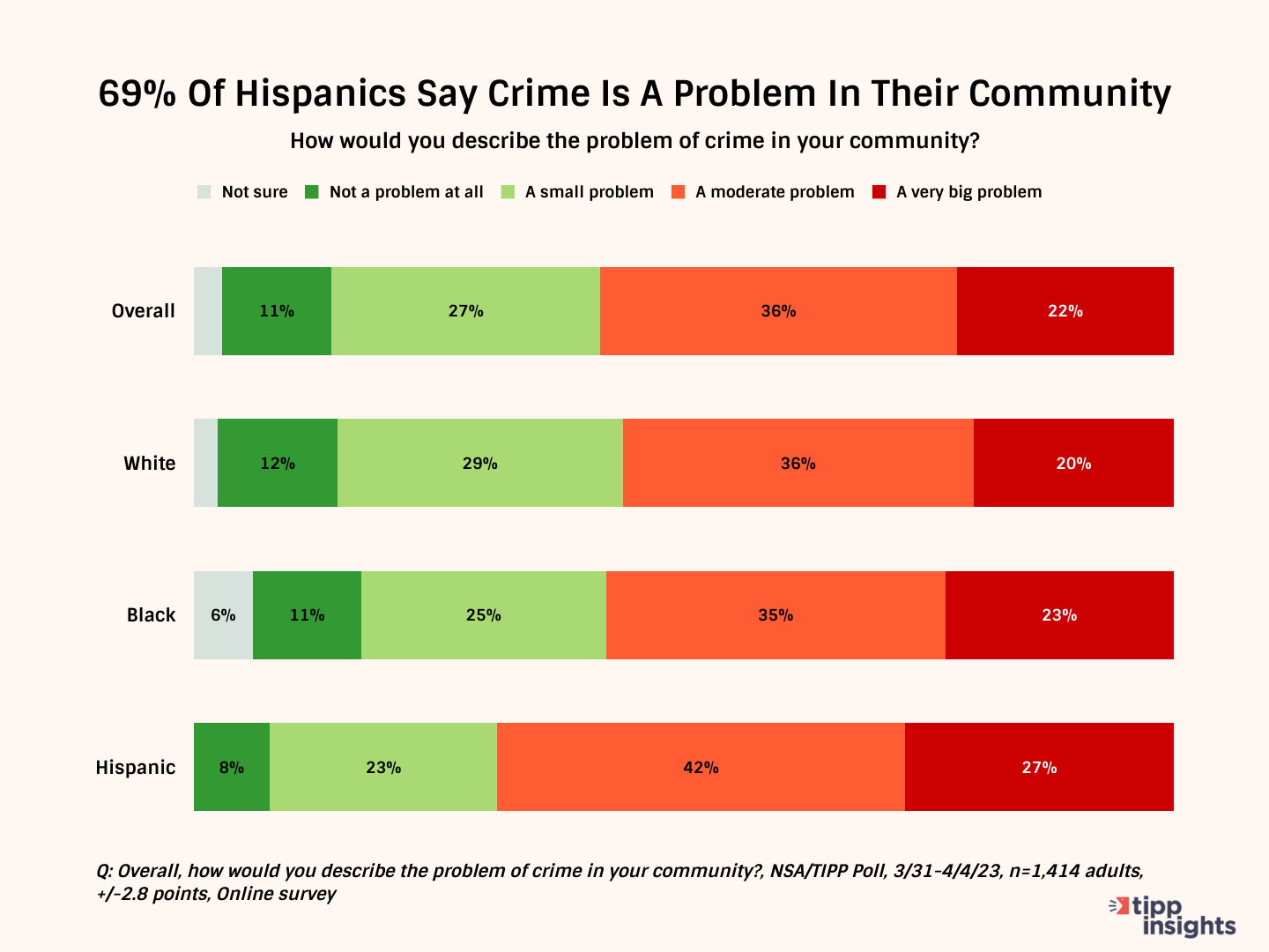 In the TIPP Poll, respondents were asked to describe the severity of crime in their communities. They were given choices ranging from "not a problem at all" to a "very big problem," with "moderate problem" and "small problem" in between. Shockingly, 58% of respondents reported that crime is a problem in their communities, with only 38% stating it is not. Of those who reported crime as a problem, 22% described it as a very big problem, and 36% said it is a moderate problem.