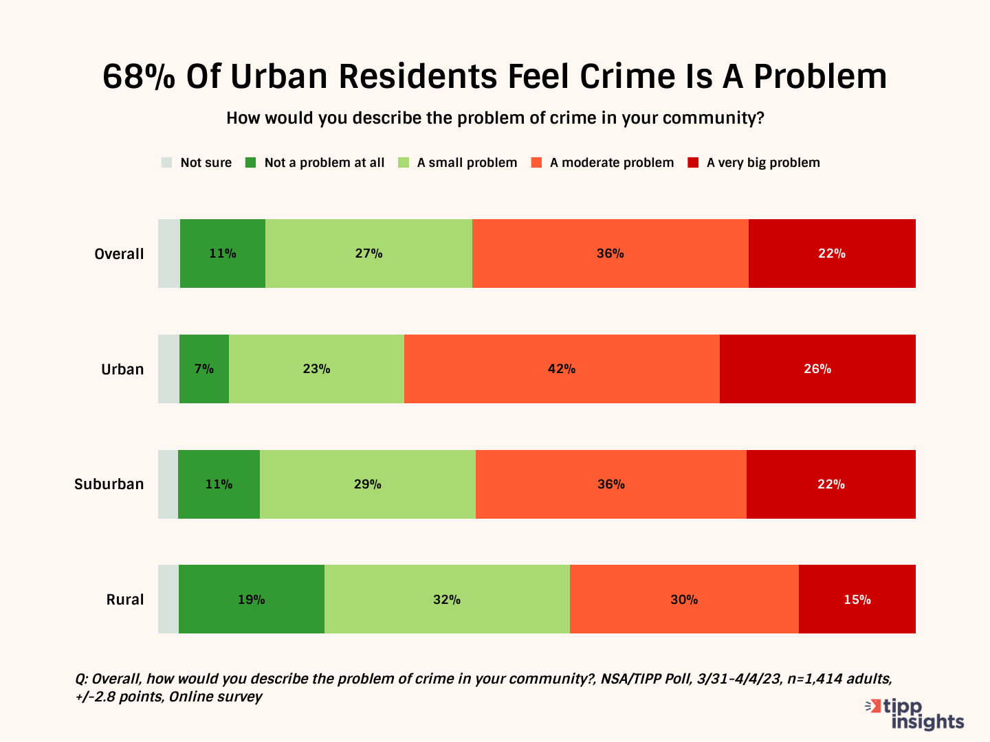 The TIPP Poll also analyzed the perception of crime by residents living in different areas. The poll found that over two-thirds of those living in urban areas (68%) consider crime a problem in their communities. A majority (58%) of suburban residents also share this sentiment. However, the situation is different in rural areas, where most respondents (51%) said that crime is not a problem in their communities. In comparison, 45% did report that it is a problem.