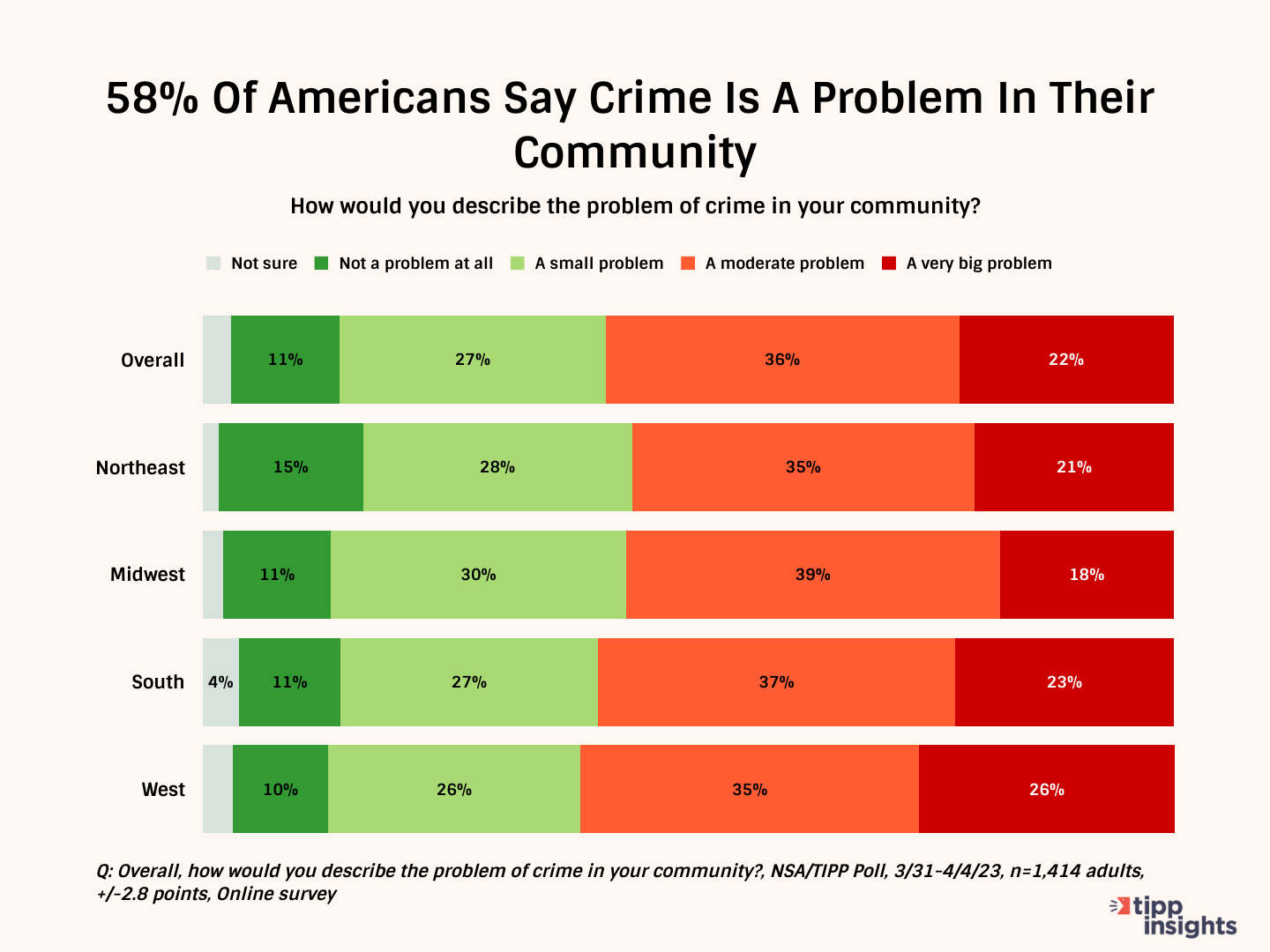 Regionally, the poll found that most respondents from the West (61%) and South (60%) reported that crime is a problem in their communities. In the Northeast, 56% of respondents reported the same, and in the Midwest, 57% did so.