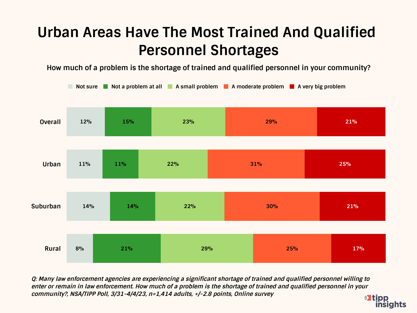 Most urban (56%) and suburban (51%) report a shortage of trained personnel. The only exception is rural areas (50%), with one-half saying the shortage is not a problem. However, 42% of rural areas suffer from personnel shortages.