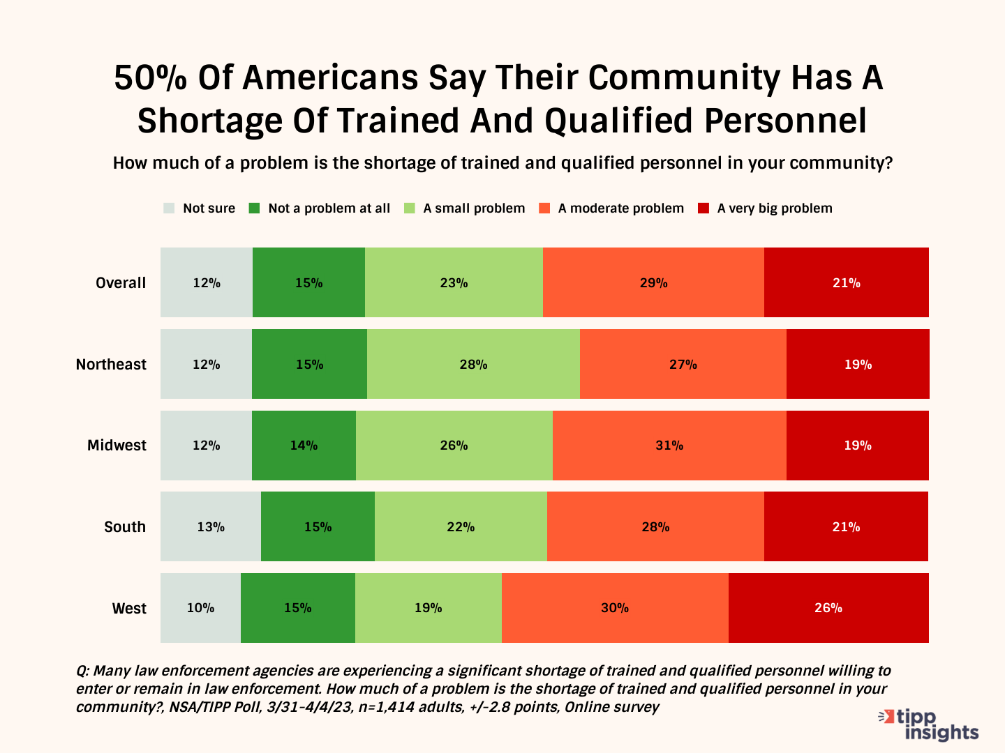 The poll found that 56% of those residing in the West, 50% of those in the Midwest, 49% of those in the South, and 46% in the Northeast believe that their communities are affected by a shortage of trained law enforcement personnel.