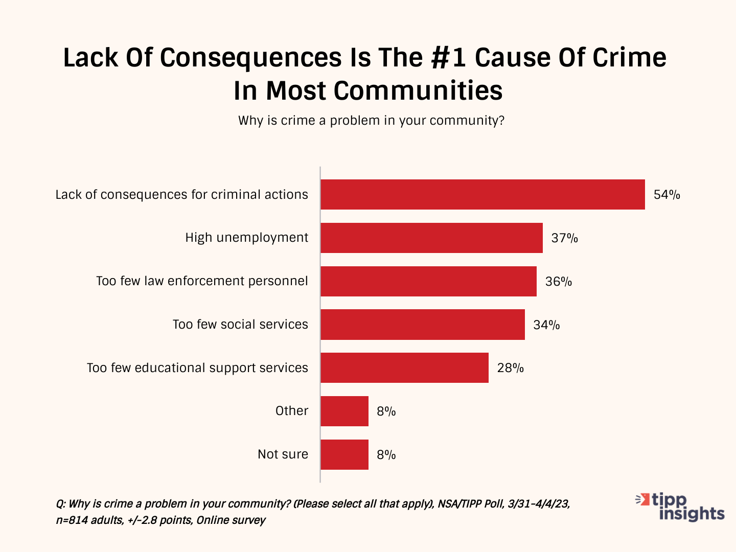 According to those who consider crime a big problem, the lack of consequences for criminal actions is the most prominent reason, with 54% of respondents selecting it as the primary cause.