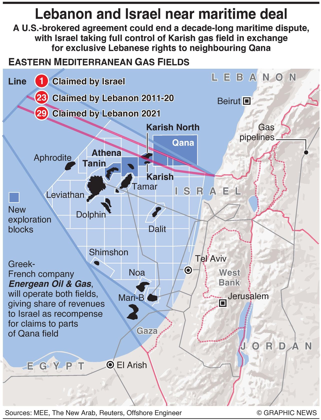 Under the proposal, Greek-French company Energean Oil & Gas PLC will operate both fields, giving a share of revenues to Israel as recompense for claims to parts of the Qana field.