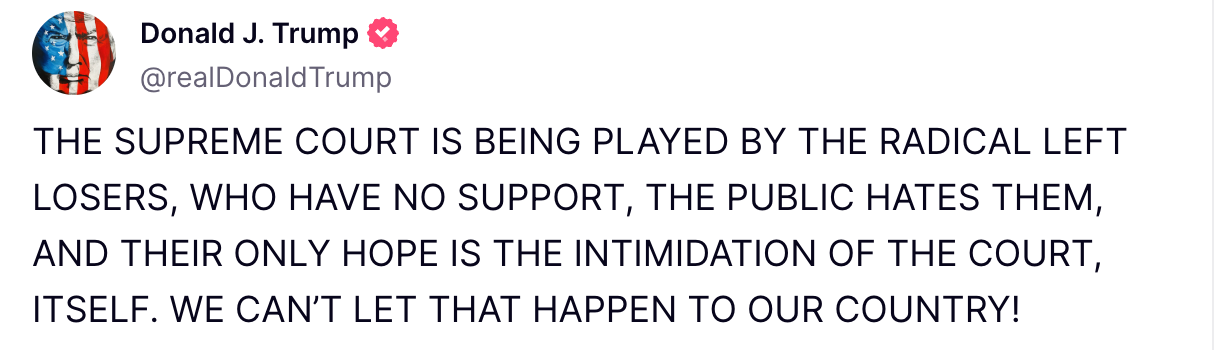 Trump added Friday morning: “The Supreme Court is being played by the radical Left losers. Their only hope is the intimidation of the court."