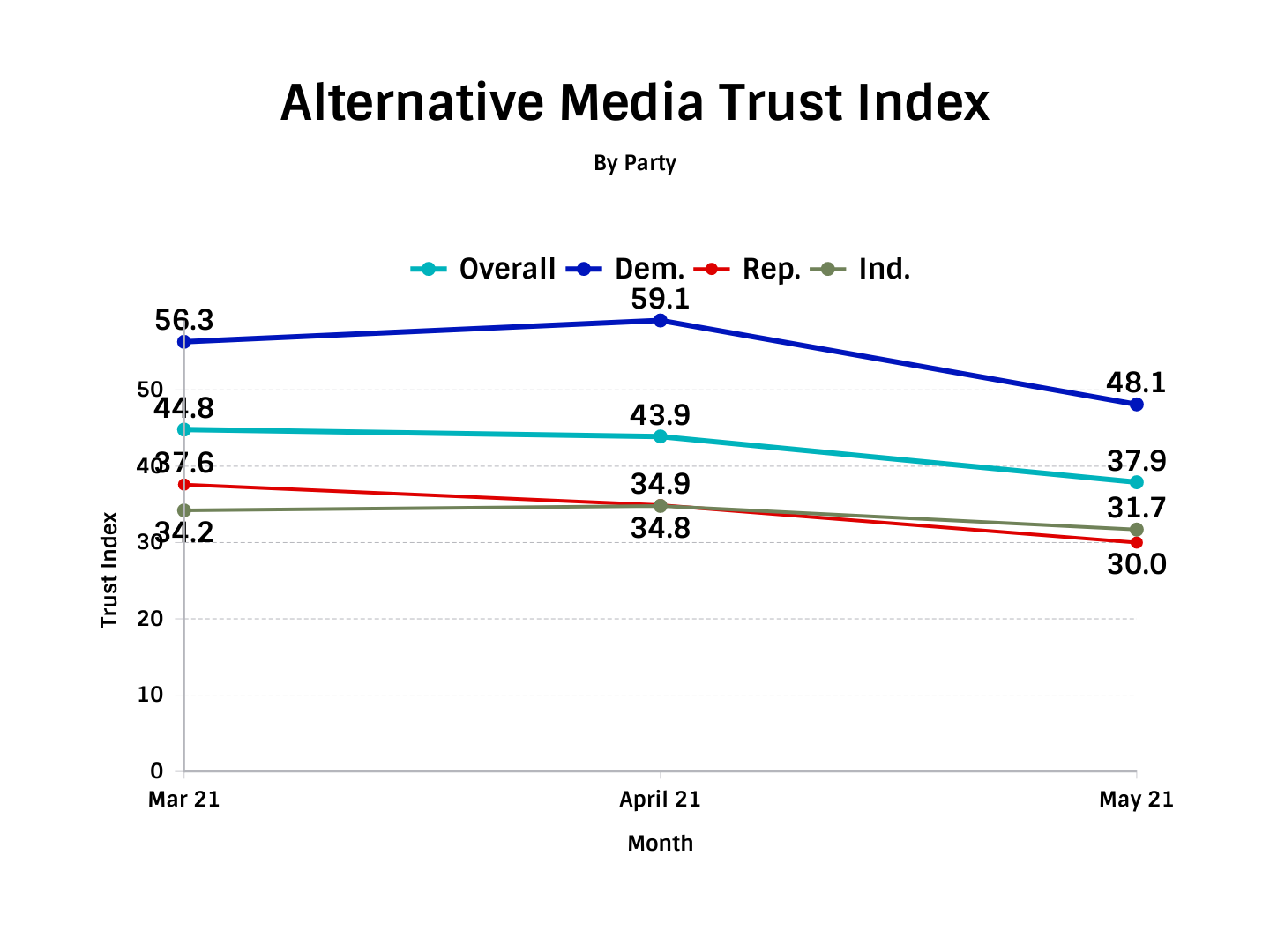 The TIPP Alternative Media Trust Index had a sharp slide of 6.0 points or 13.7%, from 43.9 in April to 37.9 in May.