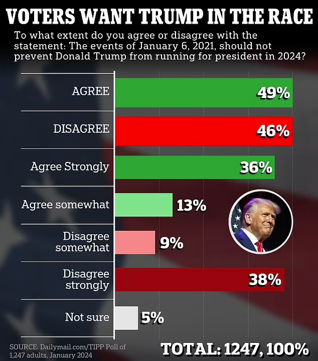 A DailyMail.com/TIPP Poll has revealed that 49 percent of respondents said the events of J6 should not prevent Trump from standing, while 46 percent said they were grounds for removing his name from ballots.