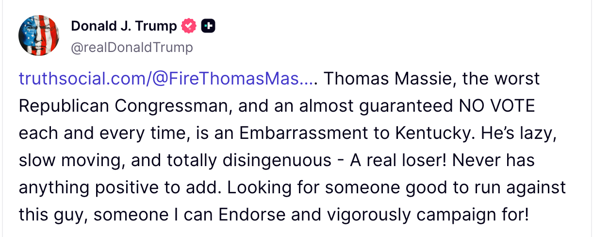 President Donald Trump has signaled his intent to back a 2026 primary challenger against Rep. Thomas Massie (R-KY), a frequent critic within GOP ranks. In a sharply worded Truth Social post Monday night, Trump called Massie “lazy,” “disingenuous,” and “an embarrassment to Kentucky.”