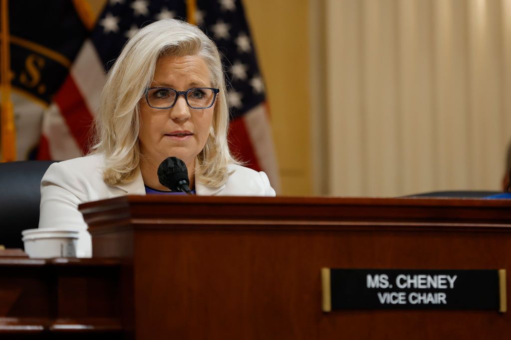 Rep. Liz Cheney (R-WY), Vice Chairwoman of the House Select Committee to Investigate the January 6th Attack on the U.S. Capitol, delivers closing remarks during a prime-time hearing in the Cannon House Office Building on July 21, 2022 in Washington, DC. (Photo by Tasos Katopodis/Getty Images)