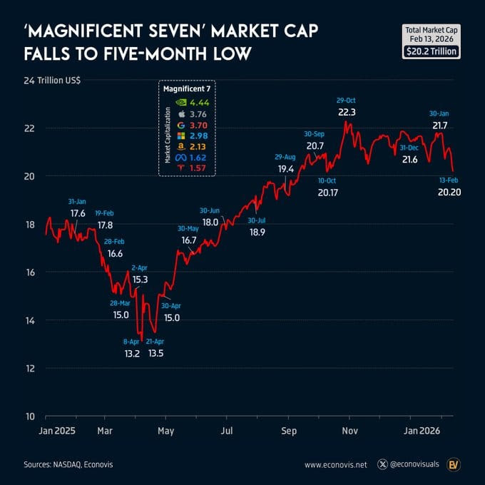 The combined market value of the Magnificent Seven has fallen to about $20 trillion, its lowest level in five months, reflecting recent tech-sector weakness after last year’s strong rally. Current market caps are Nvidia ($4.44T), Apple ($3.76T), Alphabet ($3.70T), Microsoft ($2.98T), Amazon ($2.13T), Meta ($1.62T), and Tesla ($1.57T)