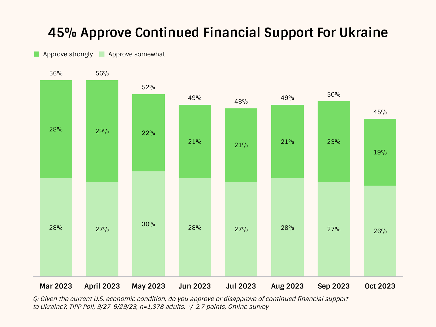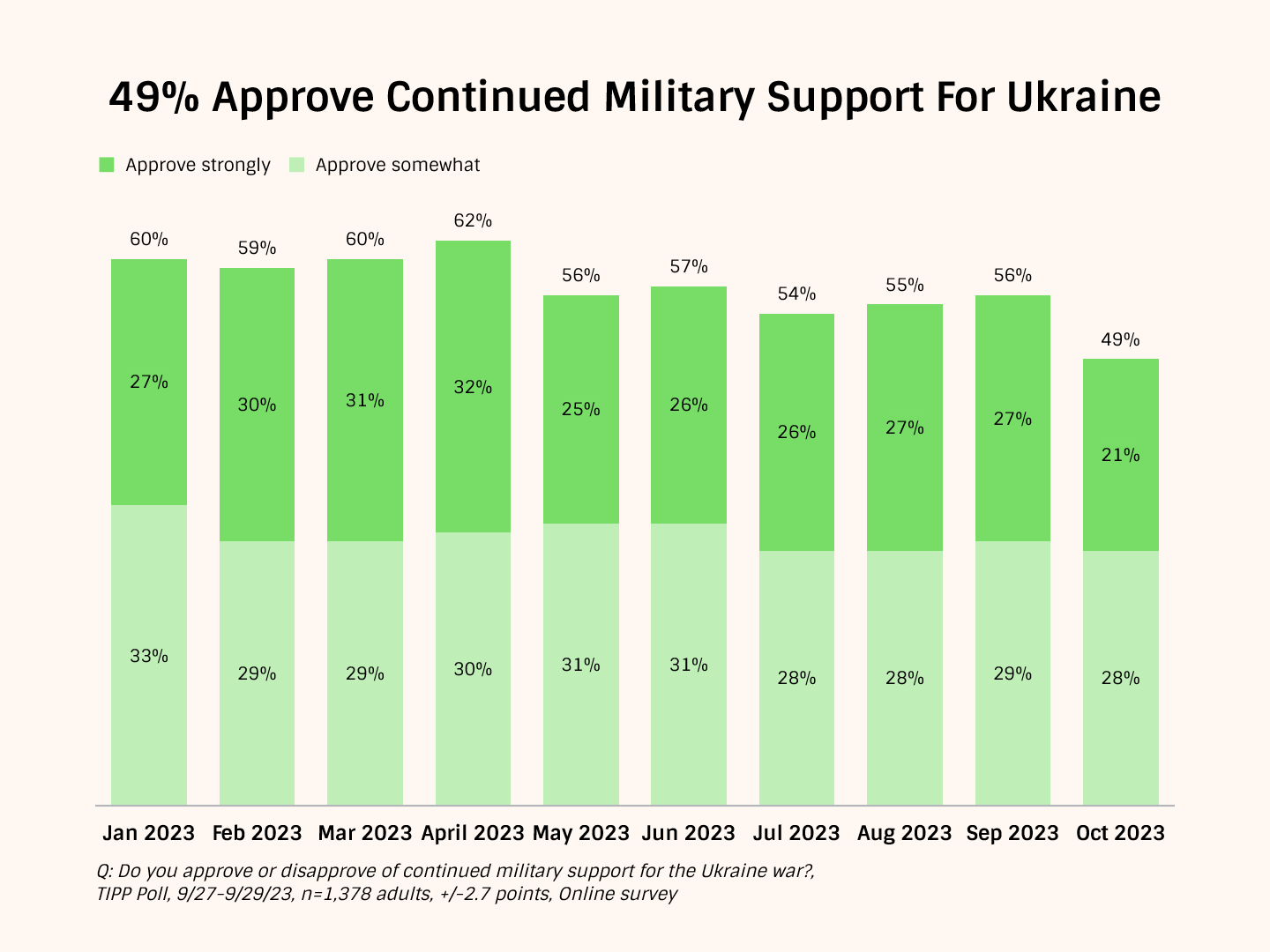 It’s also undermining U.S. support. TIPP Insights polling data show that support for financial aid to Ukraine has fallen from 56% in March to 45% in October, while backing for military support has dropped from 62% in April to 49% this month.