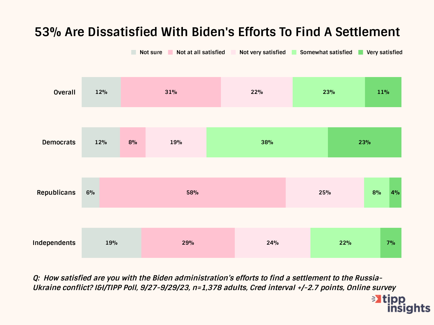 To find the answer, the October I&I/TIPP Poll asked voters: “How satisfied are you with the Biden administration’s efforts to find a settlement to the Russia-Ukraine conflict?”