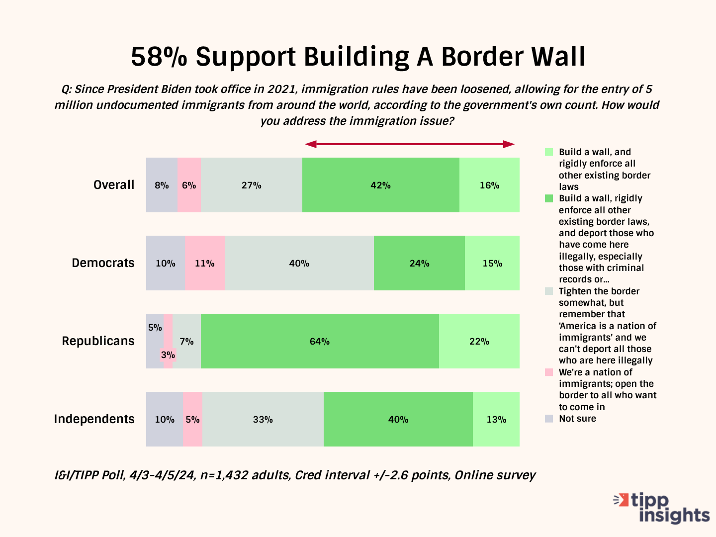 When it comes to immigration, one thing is clear: Americans overwhelmingly favor building a border wall and strongly enforcing existing immigration laws, the latest I&I/TIPP Poll shows. It’s a big reason why immigration has become the No. 1 issue in the 2024 presidential election.
