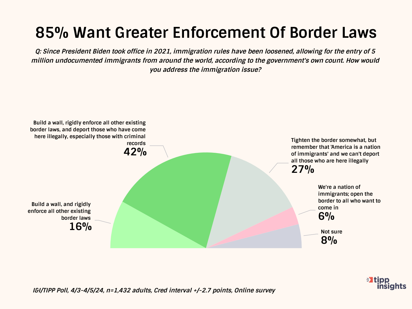 When you total it all up, 85% of Americans want greater enforcement of border laws, though to varying degrees. Just 6% agreed with the “open border” response, No. 4. Meanwhile, 8% said they were “not sure.”