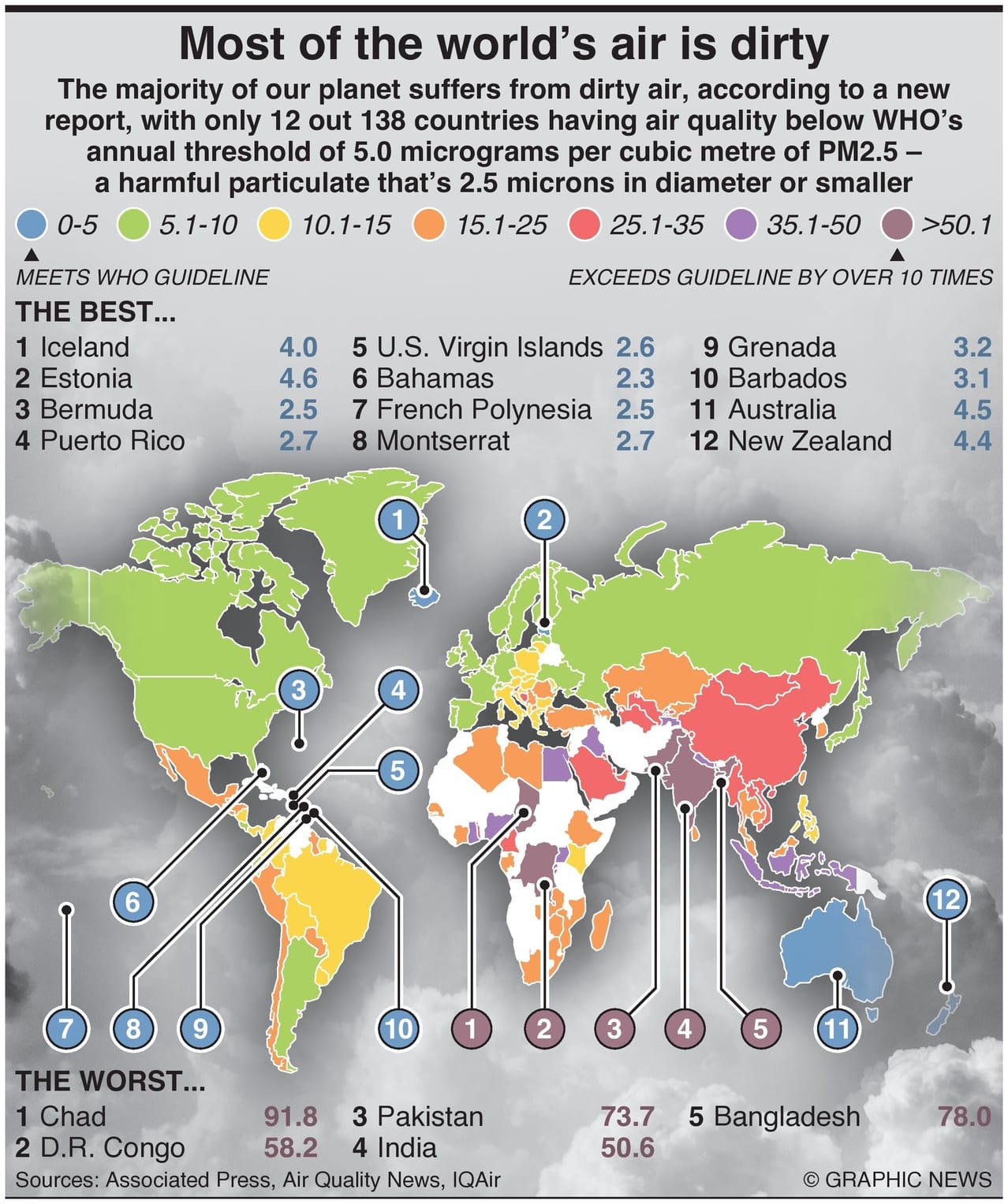 The majority of our planet suffers from dirty air, according to a new report, with only 12 out 138 countries having air quality below WHO’s annual threshold of 5.0 micrograms per cubic meter of PM2.5 – a harmful particulate that’s 2.5 microns in diameter or smaller.