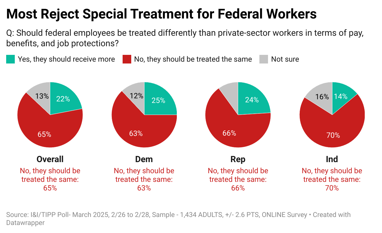 The national online I&I/TIPP Poll, taken from Feb. 24-26, asked 1,434 adults the following question: "Should federal employees be treated differently than private-sector workers in terms of pay, benefits, and job protections?" The poll has a margin of error of +/-2.6 percentage points.