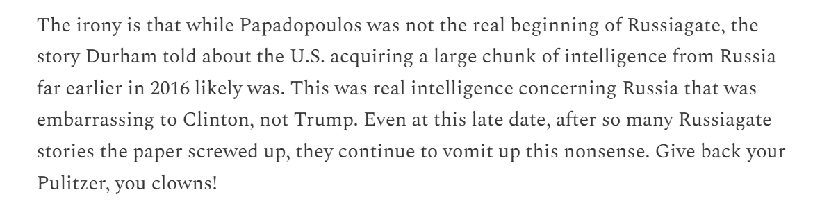 The piece also skewers the Times' infamous origin story about Trump aide George Papadopoulos. Taibbi cites both Alexander Downer and FBI Deputy Director Andrew McCabe to show that Papadopoulos' alleged "Russia tip" was a dead-end quickly dropped by investigators. Still, the Times continued to present him as a central figure.