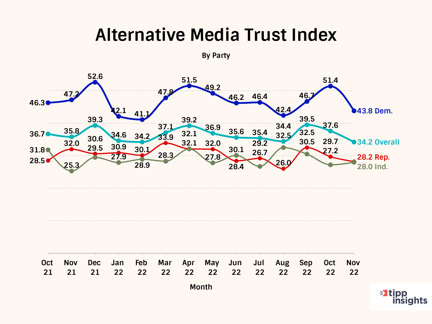 November, the month of the 2022 midterms, was a disaster for the media. The Traditional Media Trust Index fell from 39.2 in October to 38.1 in November, its lowest-ever reading since the index was created in March of 2021.