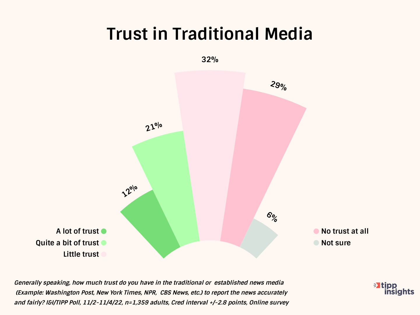 In the case of the traditional media, just 33% of poll respondents said they either had a “lot of trust” (12%) or “quite a bit of trust” (21%) in these outlets. But the “No trust” group totaled 61%, with 32% expressing “little trust” and 29% “no trust at all.”
