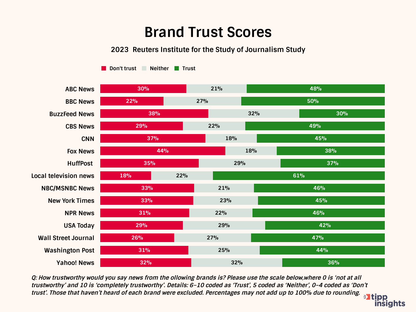 Our findings are consistent with research released by the Reuters Institute for the Study of Journalism. The Reuters study included 15 media brands. Respondents rated the brands on a 10-point scale from 0 to 10, where 0 is not at all trustworthy and ten is completely trustworthy. Those giving 5-10 were deemed to trust. Even with this lenient criterion, only one out of the 15 brands received a trust rating of 50%.