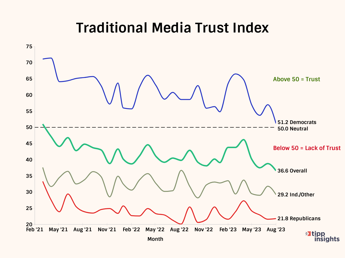 The TIPP Poll asks the media trust question monthly and converts the responses to a compact index number to facilitate ongoing tracking. The index ranges from 0 to 100. 50 is neutral, above 50 is positive, and below 50 is negative zone.