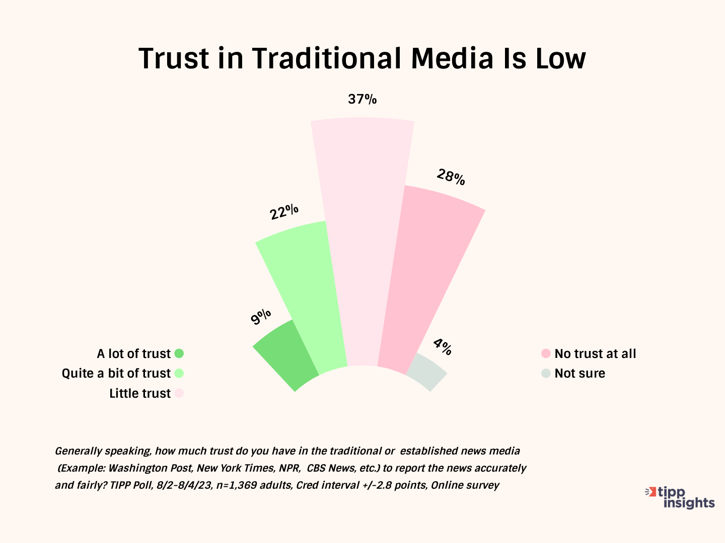 Most Americans don’t trust the media. In a TIPP Poll of 1,359 Americans completed in early August, nearly two-thirds (65%) had no confidence in the traditional media. While 37% had little trust, 28% said no trust at all.