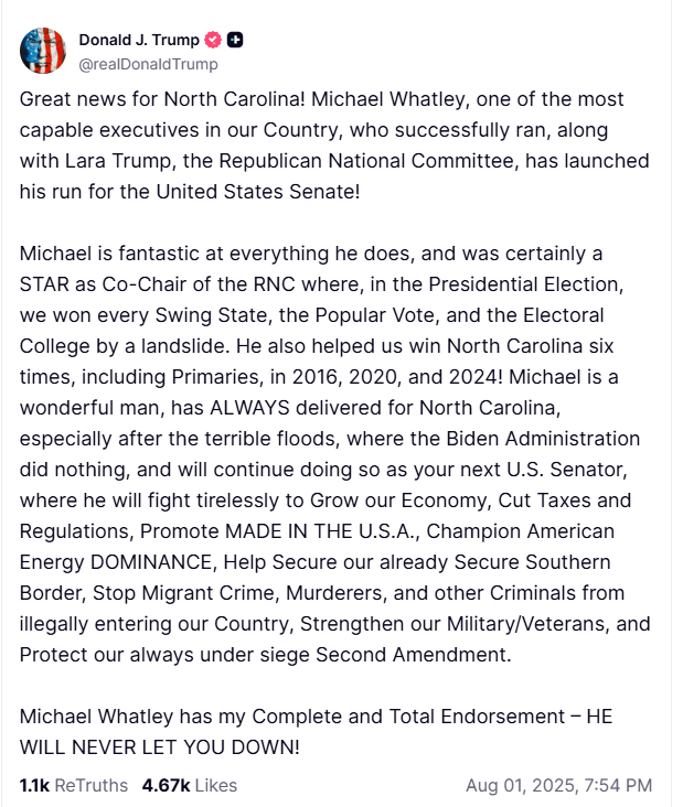 — Michael Whatley (@ChairmanWhatley) July 31, 2025