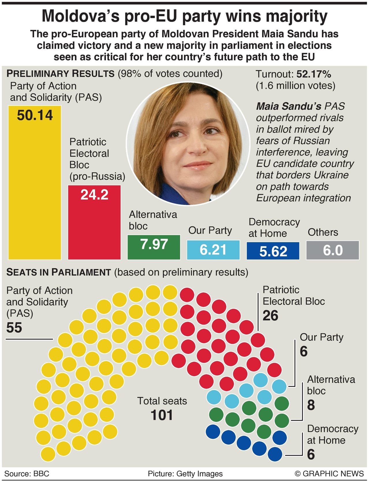 Sandu’s Party of Action and Solidarity (PAS) secured 50% of the vote, with 99.9% of the 1.6m votes counted, far ahead of the pro-Russian Patriotic Electoral Bloc on under 25%.