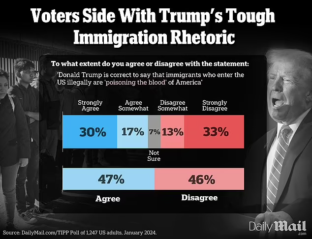 A startling number of Americans agree with Donald Trump's harsh language against immigrants, and his assertion that undocumented arrivals are 'poisoning the blood' of the nation, our survey shows.