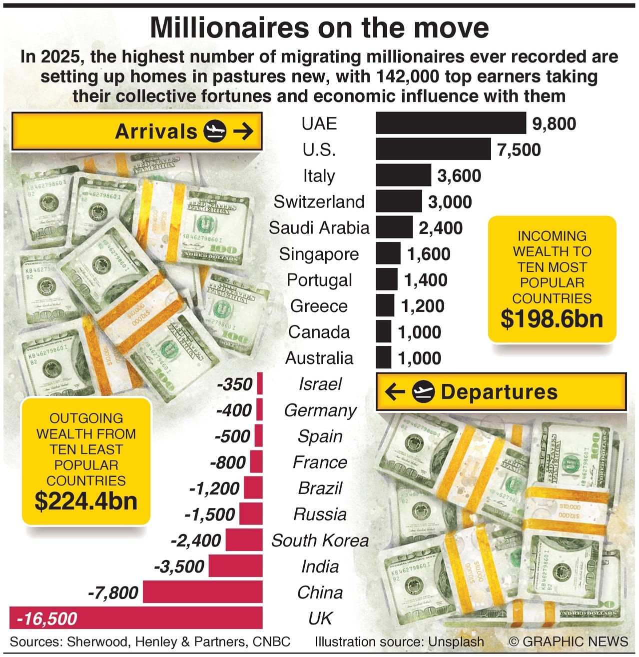 But with every winner comes a loser. The UAE is at the top, with an estimated 9,800 millionaires expected to move there this year, bringing with them $63 billion in wealth.