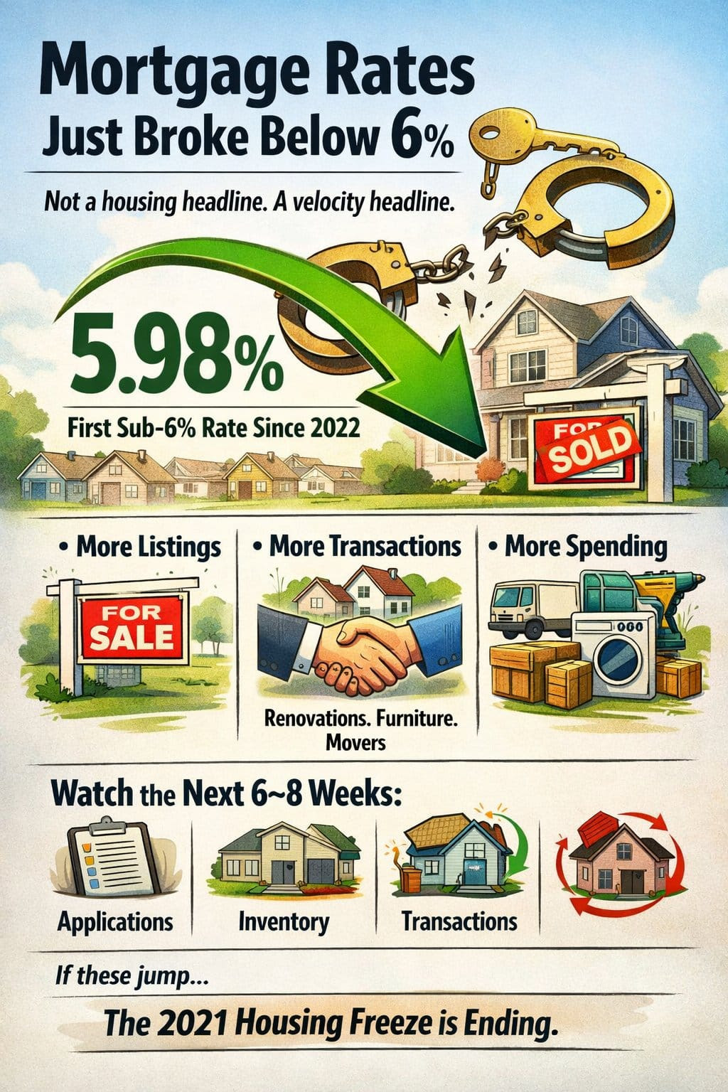 Mortgage rates have slipped below 6% for the first time since 2022. Many homeowners have been “locked in” to ultra-low rates and unwilling to move. As market rates approach those levels, listings, purchase applications, and transaction activity could begin to pick up. If that momentum builds over the next 6 to 8 weeks, housing turnover and related spending on renovations, furniture, and moving services may accelerate.