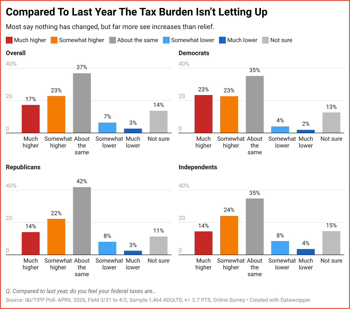 In its monthly national online poll, I&I/TIPP asked 1,464 adults about their taxes. The poll, taken from March 31 to April 2, has a margin of error of +/-2.7 percentage points.