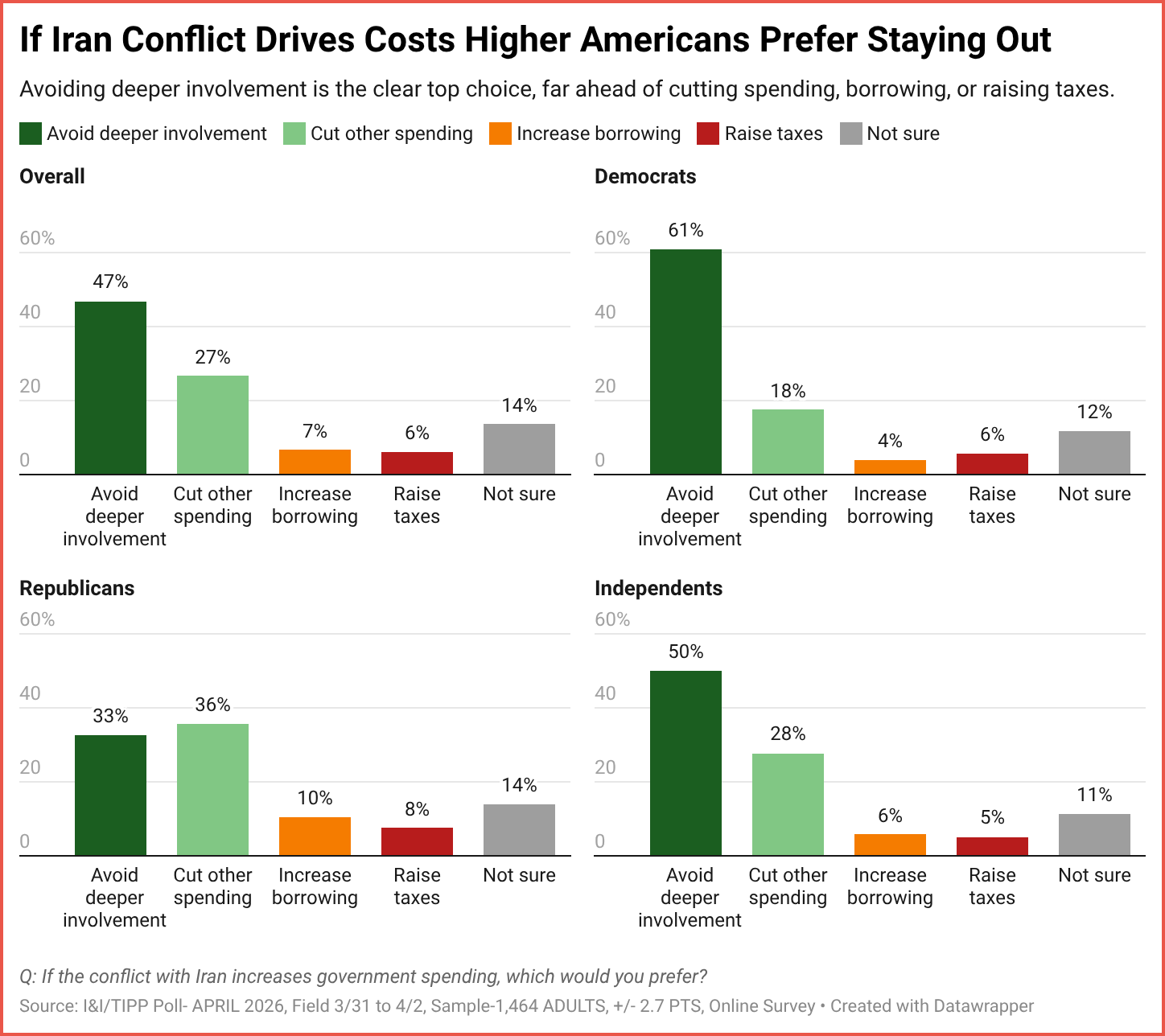 The five possible answers were, in descending order: “The U.S. should avoid deeper involvement to limit costs” (47%); “Reduce other government spending” (27%); “Increase borrowing/deficit spending” (7%); and finally, “Raise taxes to pay for it” (6%). “Not sure” accounted for 13%.