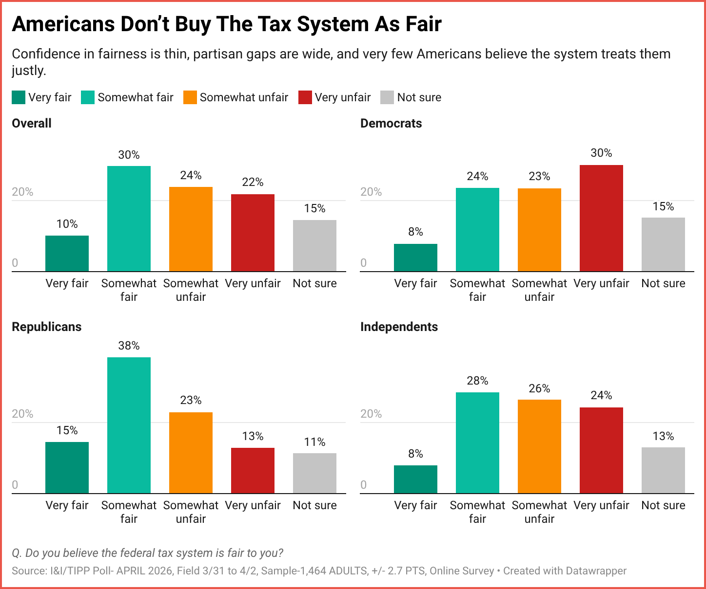 Political affiliations once again tell the tale. Democrats (32% fair, 53% unfair) and independents (36% fair, 50% unfair) find a reverse-mirror image among Republicans (53% fair, 36% unfair).