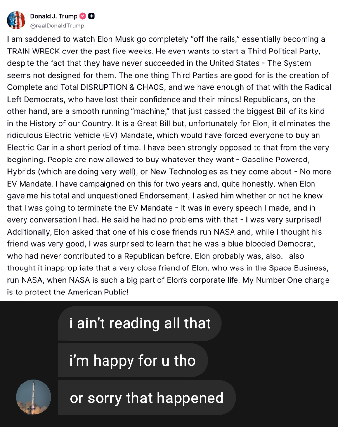 Musk responded with a viral internet meme that read: “i ain’t reading all that. i’m happy for u tho. or sorry that happened.”