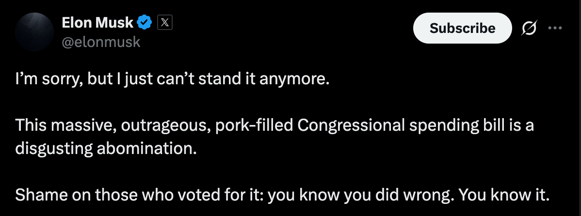 Musk warned that the bill would expand the U.S. budget deficit to $2.5 trillion and place an unsustainable debt burden on American citizens.